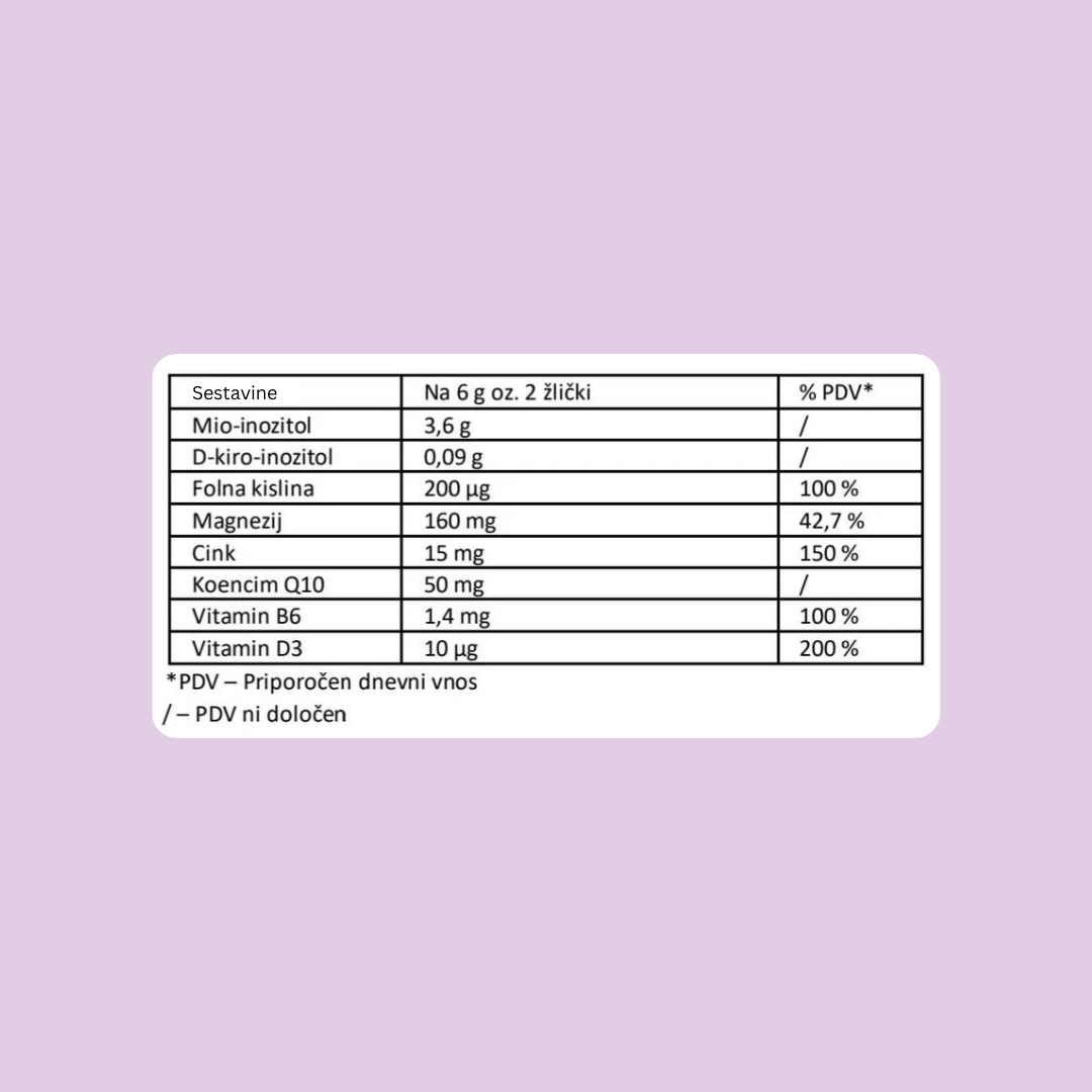Mio-inozitol, sredstvo za uravnavanje kislosti: citronska kislina, magnezijev bisglicinat, mikrokristalna celuloza, D-kiro-inozitol, kalcijev-L-metilfolat (folna kislina), cinkov citrat, vodotopen koencim Q10, sladilo: steviol glikozidi iz stevie, aroma pomaranče, piridoksin hidroklorid (vitamin B6), holekalciferol (vitamin D3).